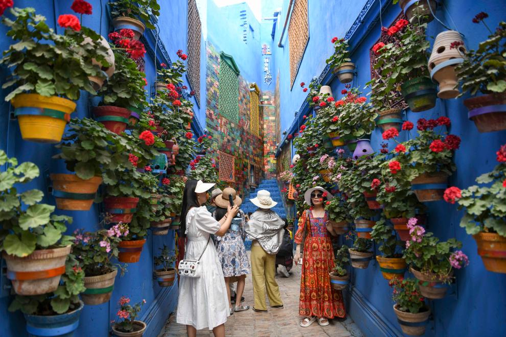 人们在新疆喀什古城景区彩虹巷内游玩拍照(2023年6月14日摄)。新华社记者 胡虎虎 摄