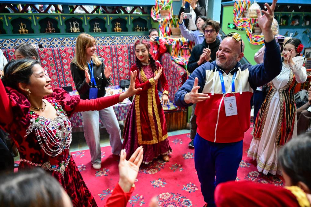 在新疆喀什古城景区“古丽的家”旅游家访点,第六届世界媒体峰会的与会嘉宾和当地居民一起舞蹈(2024年10月16日摄)。新华社记者 丁磊 摄