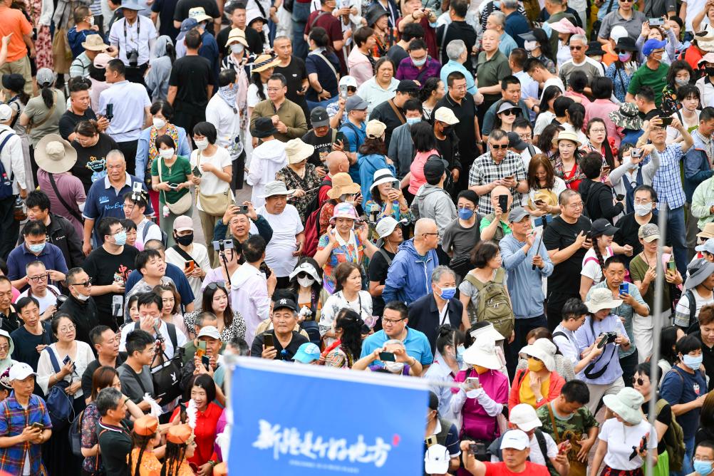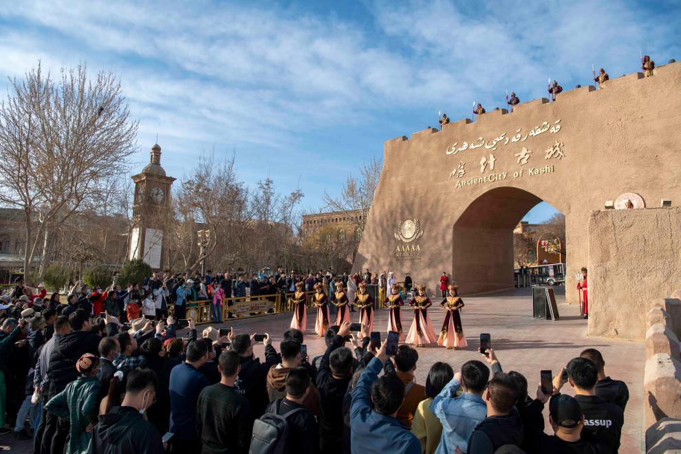 游客在新疆喀什古城景区东大门观看“开城仪式”(2023年3月10日摄)。新华社记者 胡虎虎 摄