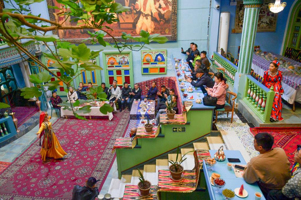 游客在新疆喀什古城景区的一家民宿内欣赏歌舞表演(2024年4月29日摄)。新华社记者 王菲 摄
