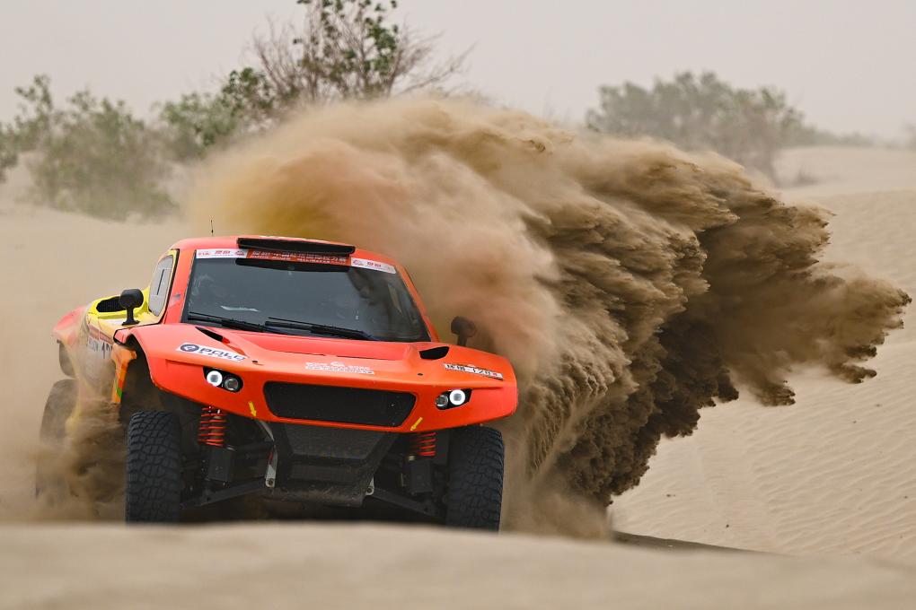 2025年5月28日,明源实业·承德雷锋CR7车队车手孙昊、领航员王东东在比赛中。当日,2025中国环塔国际拉力赛第八赛段在新疆喀什地区叶城县进行。新华社记者 辛悦卫 摄