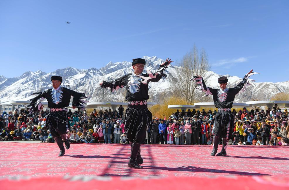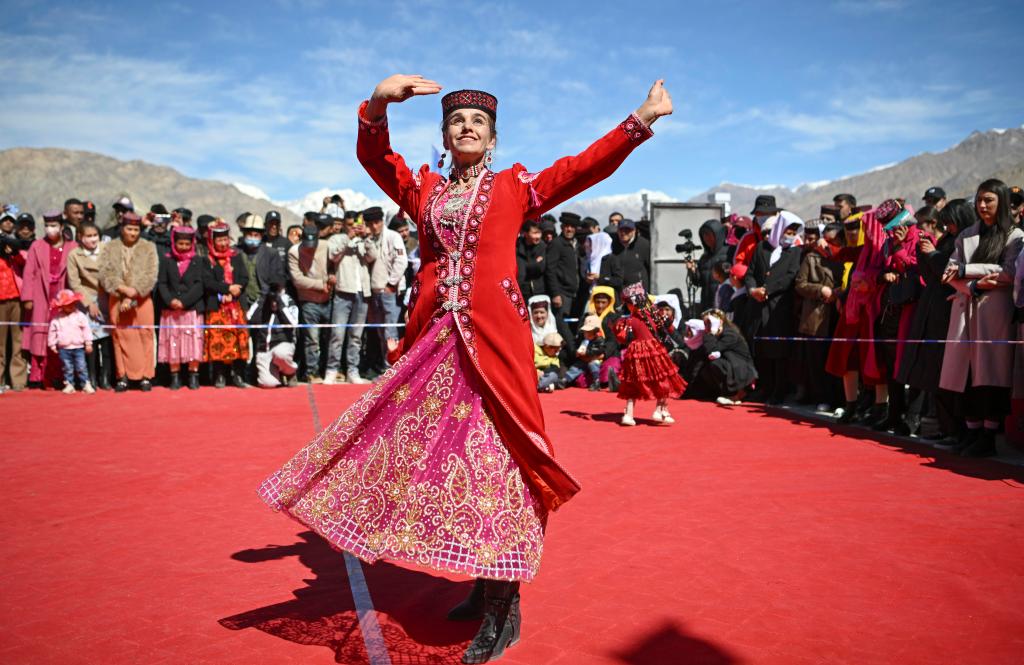 在新疆塔什库尔干塔吉克自治县提孜那甫乡赛马场,参与非遗展演的村民在跳舞(2025年3月23日摄)。新华社记者 胡虎虎 摄