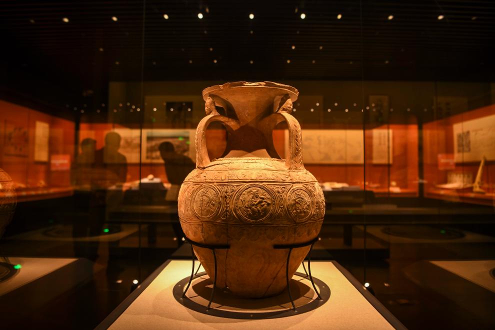 这是在新疆喀什地区博物馆拍摄的国家一级文物“三耳压花陶罐”(2023年6月12日摄)。新华社记者 胡虎虎 摄