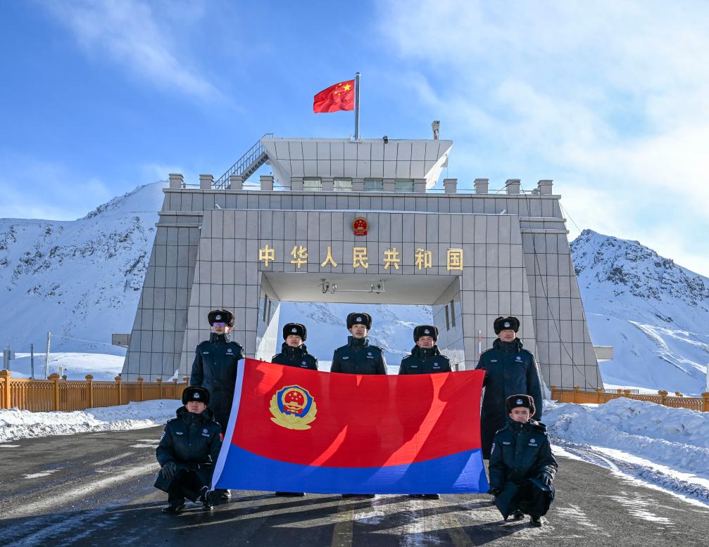 新疆红其拉甫出入境边防检查站新警在红其拉甫国门前与警旗合影(2025年1月10日摄)。新华社记者 陈朔 摄