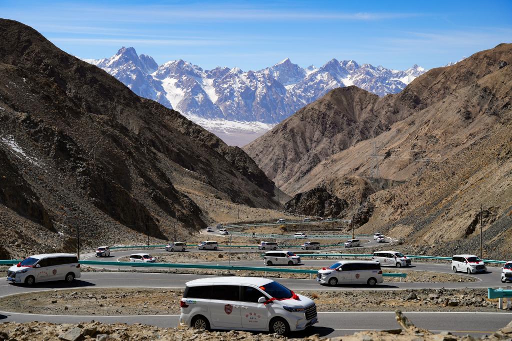 在新疆塔什库尔干塔吉克自治县,参加“盘龙古道”恢复通车仪式的车队在行进中(2025年3月22日摄)。新华社记者 徐宏岩 摄