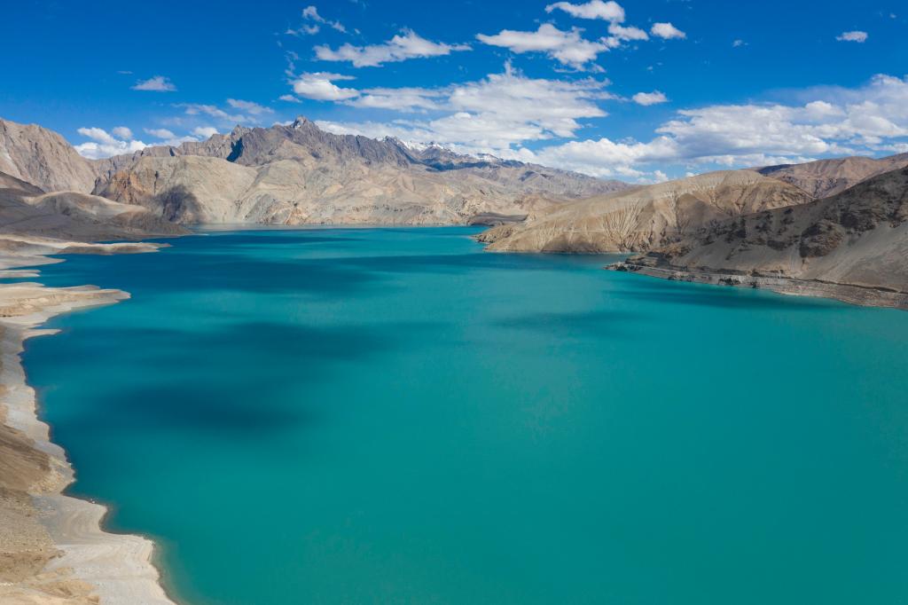 位于新疆塔什库尔干塔吉克自治县的“班迪尔蓝湖”一角(2023年8月28日摄,无人机照片)。新华社记者 胡虎虎 摄