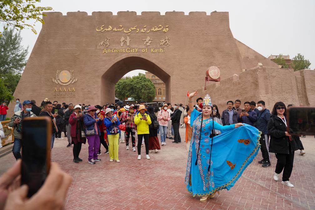 在新疆喀什古城景区,游客打卡拍照(2023年4月21日摄)。新华社记者 丁磊 摄