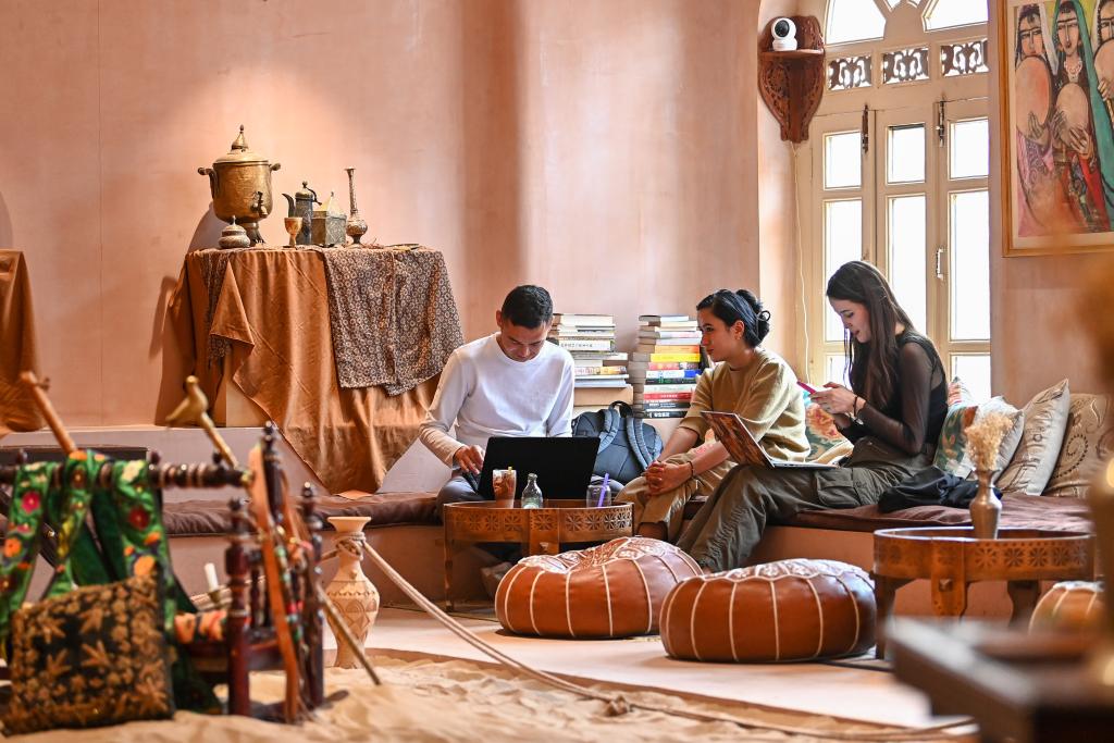 在新疆喀什古城景区,游客在麦吾兰·图拉克的咖啡馆休息(2023年4月17日摄)。新华社记者 丁磊 摄