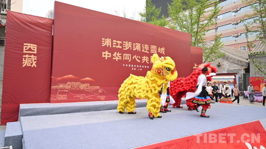 图为西藏自治区昌都市洛隆县文艺代表团在蒙藏学校旧址表演硕督狮子舞