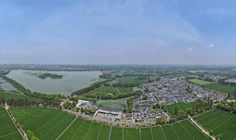 空中俯瞰位于淀山湖水域的大莲湖及周边的莲湖村(2024年8月8日摄,无人机照片)。