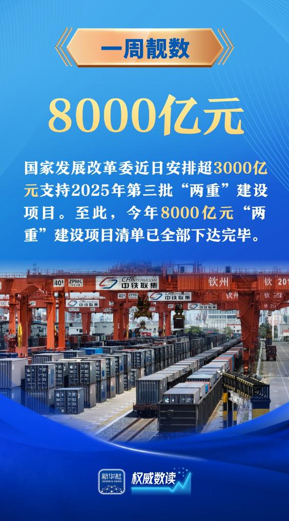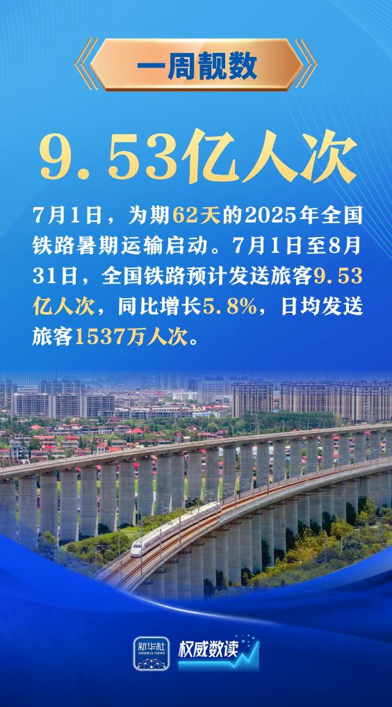 今年“暑运”期间全国铁路预计发送旅客9.53亿人次;今年8000亿元“两重”建设项目清单已全部下达完毕;前5个月我国规上互联网企业完成互联网业务收入7735亿元……本周这些“靓”数,值得关注。