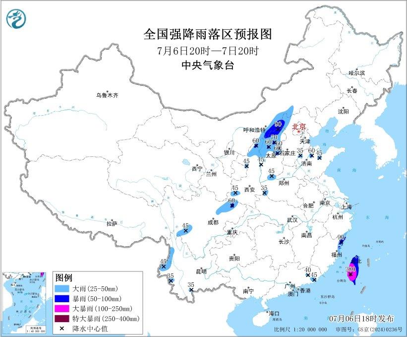 预计,7月6日20时至7日20时,内蒙古中部偏南地区、陕西北部和南部、山西中北部、河北西北部、河南西部、山东北部、川西高原南部和四川盆地西北部、云南西部、浙江南部沿海、福建北部沿海、广东东部、台湾岛等地部分地区有大到暴雨,其中,台湾岛中南部有大暴雨,局地特大暴雨(250~280毫米)。上述部分地区伴有短时强降水(最大小时降雨量20~50毫米,局地可超过70毫米),局地有雷暴大风等强对流天气。