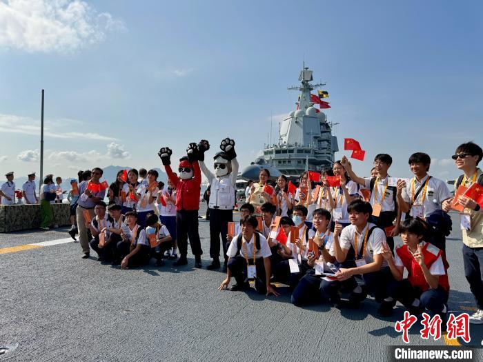7月4日,山东舰举行开放参观活动。据了解,由中国人民解放军海军航空母舰山东舰,导弹驱逐舰延安舰、湛江舰及导弹护卫舰运城舰组成的航母编队抵达香港,开启为期5天的访问活动。图为香港青少年和山东舰官兵装扮的“大熊猫”合影。中新社记者 戴梦岚 摄