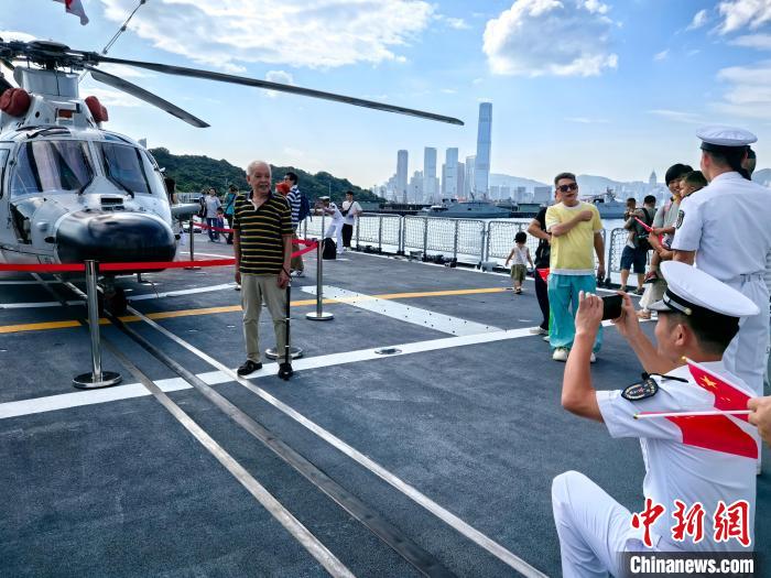 7月5日,正在香港访问的中国人民解放军海军山东舰航母编队向香港民众开放参观。编队中的运城舰、湛江舰,在中国人民解放军驻香港部队昂船洲军营码头向民众开放。图为运城舰士兵帮助香港市民与舰艇设备合影。中新社记者 刘大炜 摄