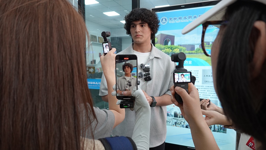 在天津轻工职业技术学院的数字化加工实训室,来自埃及的留学生小明(Ibrahim Maher)向嘉宾分享:“在鲁班工坊,我学到了先进的技术,这让我对未来的职业发展充满信心。”