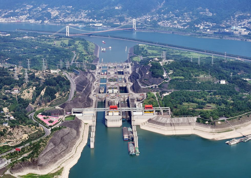 2025年6月13日,在湖北省宜昌市,船舶有序通过三峡双线五级船闸(无人机照片)。新华社发(王辉富 摄)