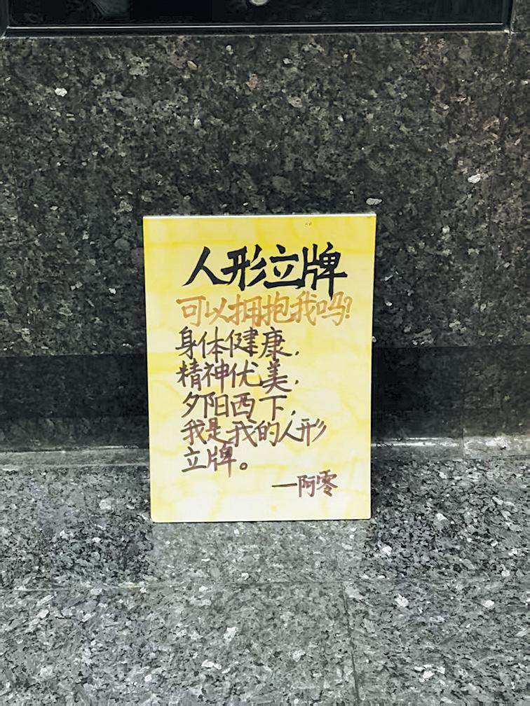 从上海的松江到外滩,阿零举着一块A3大小的纸板搭乘地铁又一路步行,纸板上面写着,“可以拥抱我吗?身体健康,精神优美。夕阳西下,我是我的人形立牌。”