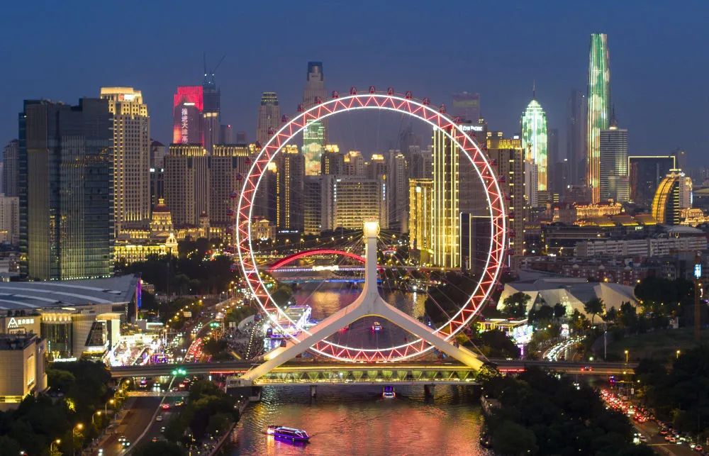 “天津之眼”摩天轮附近拍摄的海河沿岸夜景(无人机照片)。新华社记者 赵子硕 摄