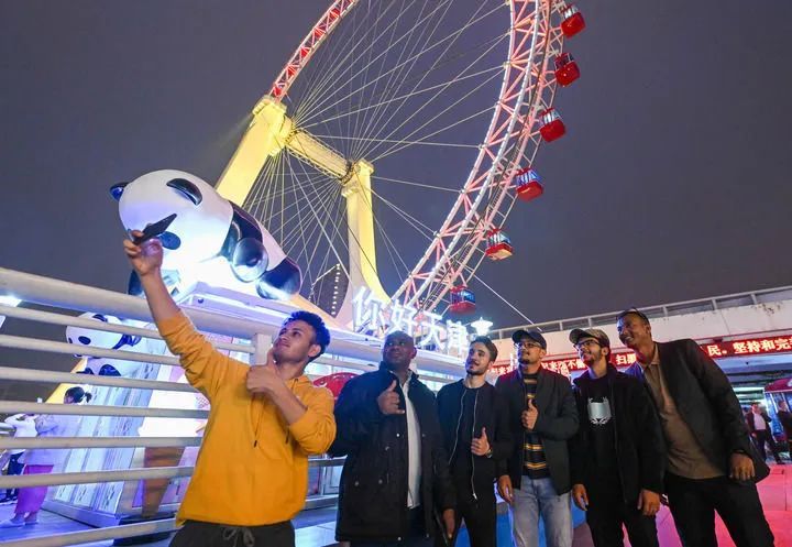 外国留学生在乘坐“天津之眼”摩天轮前拍照打卡。 新华社记者 孙凡越 摄