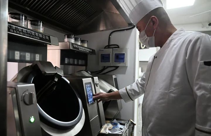 厨师在天津市和平区南营门街道的老年人“智慧食堂”后厨操作炒菜机器人。 新华社记者 赵子硕 摄