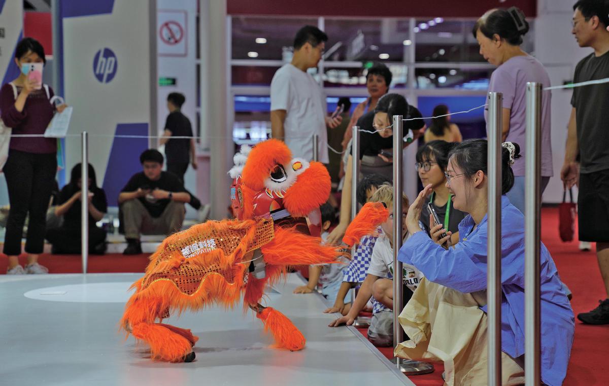 7月20日,中国国际展览中心(顺义馆),第三届链博会,一只萌萌的醒狮机器人跟观众“挥手”。 摄影/新京报记者 薛珺