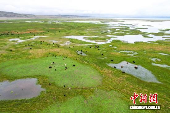 7月22日,在西藏阿里地区普兰县霍尔乡,牧民在玛旁雍错湿地上放牧牦牛。为实现更大的经济效益,霍尔乡近年来探索建立牦牛养殖专业合作社,按当地自然条件合理分配牦牛放牧地点,并将牛奶进行加工销售,2023年该合作社的年总收入达到60余万元人民币,带动牧民人均增收2万余元人民币。(无人机照片)