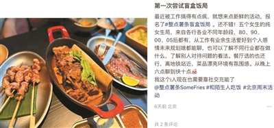 记者了解到,上述几位受访者参与的活动,都是由北京的一家名为“整点薯条”的团队组织的。该团队于去年10月开始推出“盲盒饭局”项目。