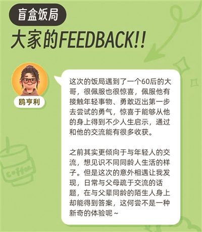 网友“发条梨子”是一名学生,参加完“盲盒饭局”后发帖表示,“这种体验很新鲜!各个行业都听起来好新奇,那么多厉害的人,一下子成了我的‘饭搭子’。”
