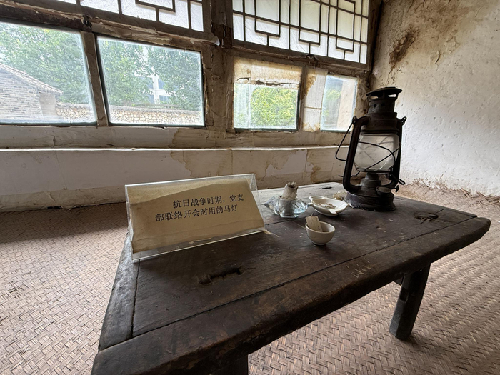 抗日战争时期,镇边城村党支部开会时用过的防风灯、炕桌等物品。