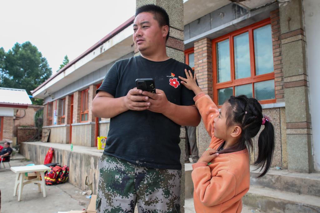 8月10日,在榆中县马坡乡上庄村临时安置点,一个小女孩将一朵小红花贴在陈万凯胸前。新华社记者 郎兵兵 摄