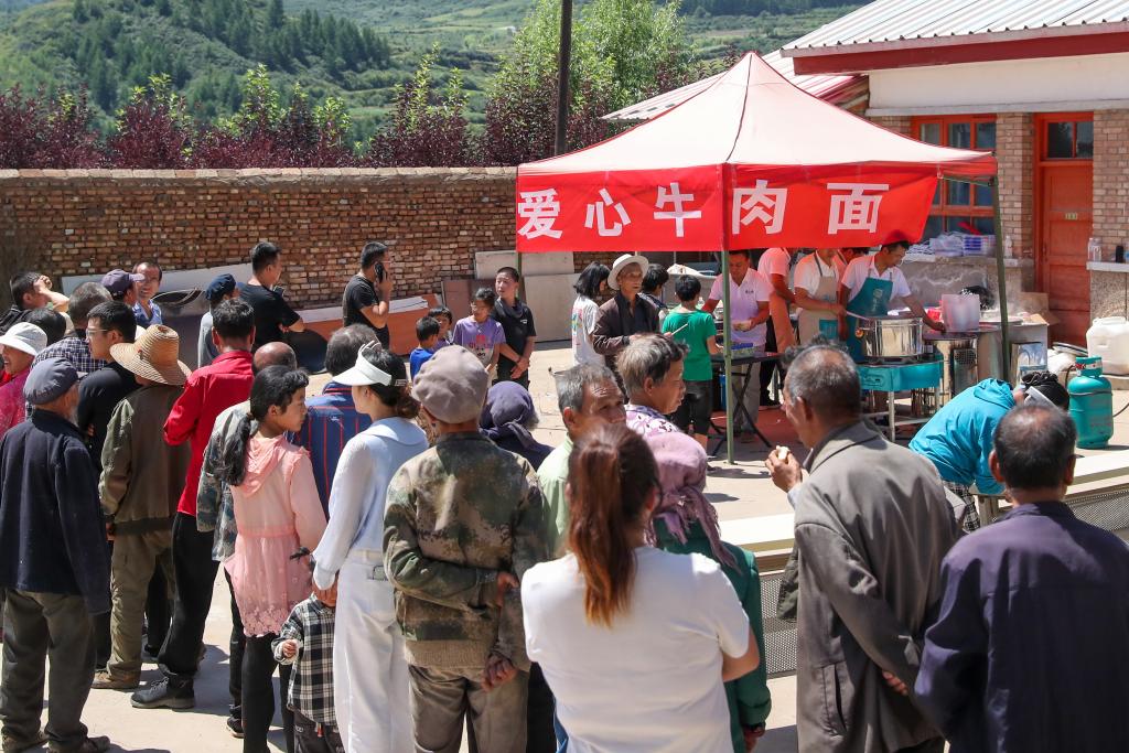 8月11日,在榆中县马坡乡上庄村临时安置点,受灾群众排队领取爱心牛肉面。新华社记者 郎兵兵 摄