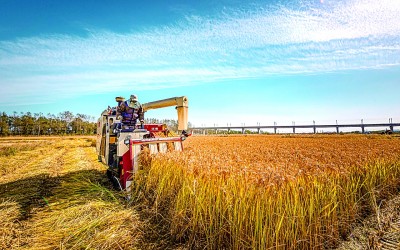 在大连金普新区登沙河街道,水稻收割机正在稻田里收割水稻。朴峰摄