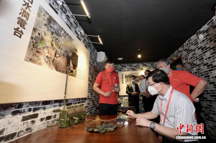 2022年9月3日,香港特区行政长官李家超(右一)出席香港沙头角抗战纪念馆揭幕典礼时,在纪念馆“石水涧电台”展区体验抗战时期电台工作。(资料图)(香港特区政府新闻处供图)