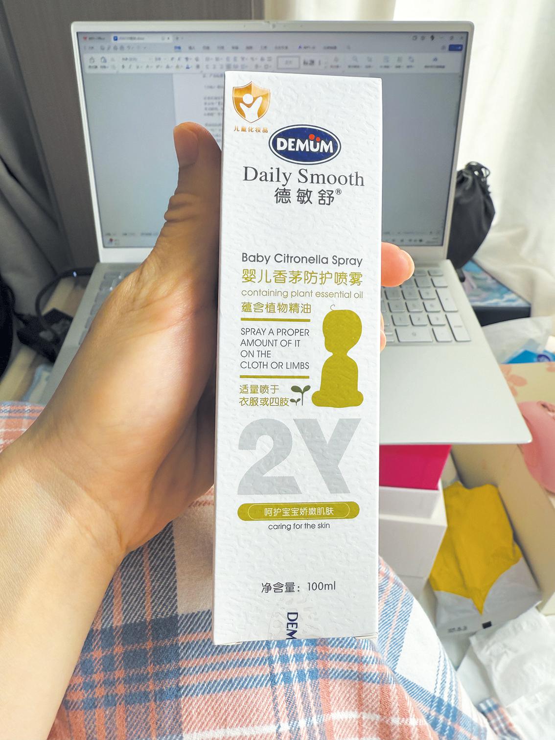 “德敏舒旗舰店”的德敏舒婴儿香茅防护喷雾,外包装标有儿童化妆品标志。 新京报记者 刘旭 摄