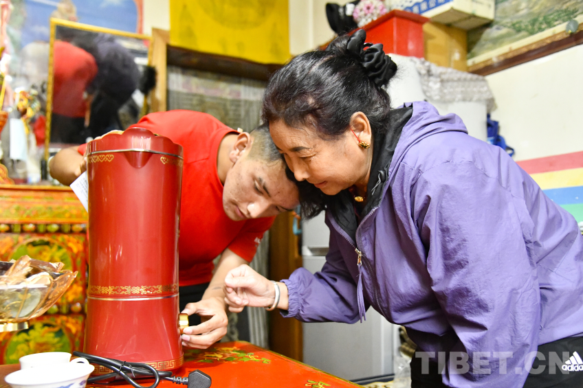 图为卓嘎与儿子罗布次仁一起仔细研究这一台全自动酥油茶壶的使用 摄影:赵振宇