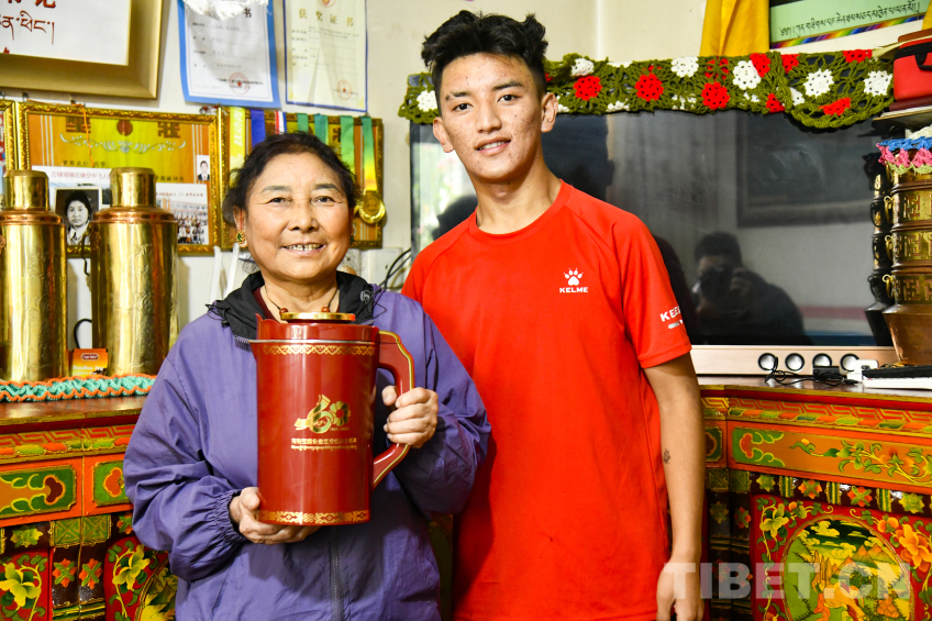 图为罗布次仁为母亲卓嘎倒上第一杯酥油茶,这对茶杯是西藏自治区成立50周年中央代表团赠送的礼物 摄影:赵振宇