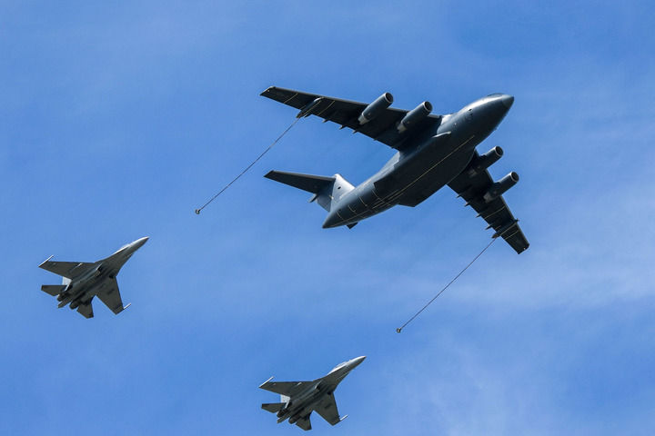 ↑9月19日,运油-20A和歼-16编队通场。新华社记者 颜麟蕴 摄