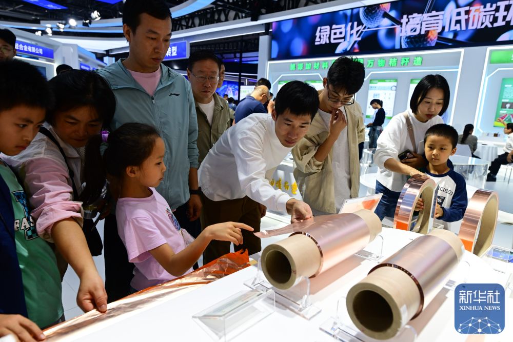 ↑ 9月20日,观众在2025世界制造业大会上参观铜箔产品。新华社记者 周牧 摄