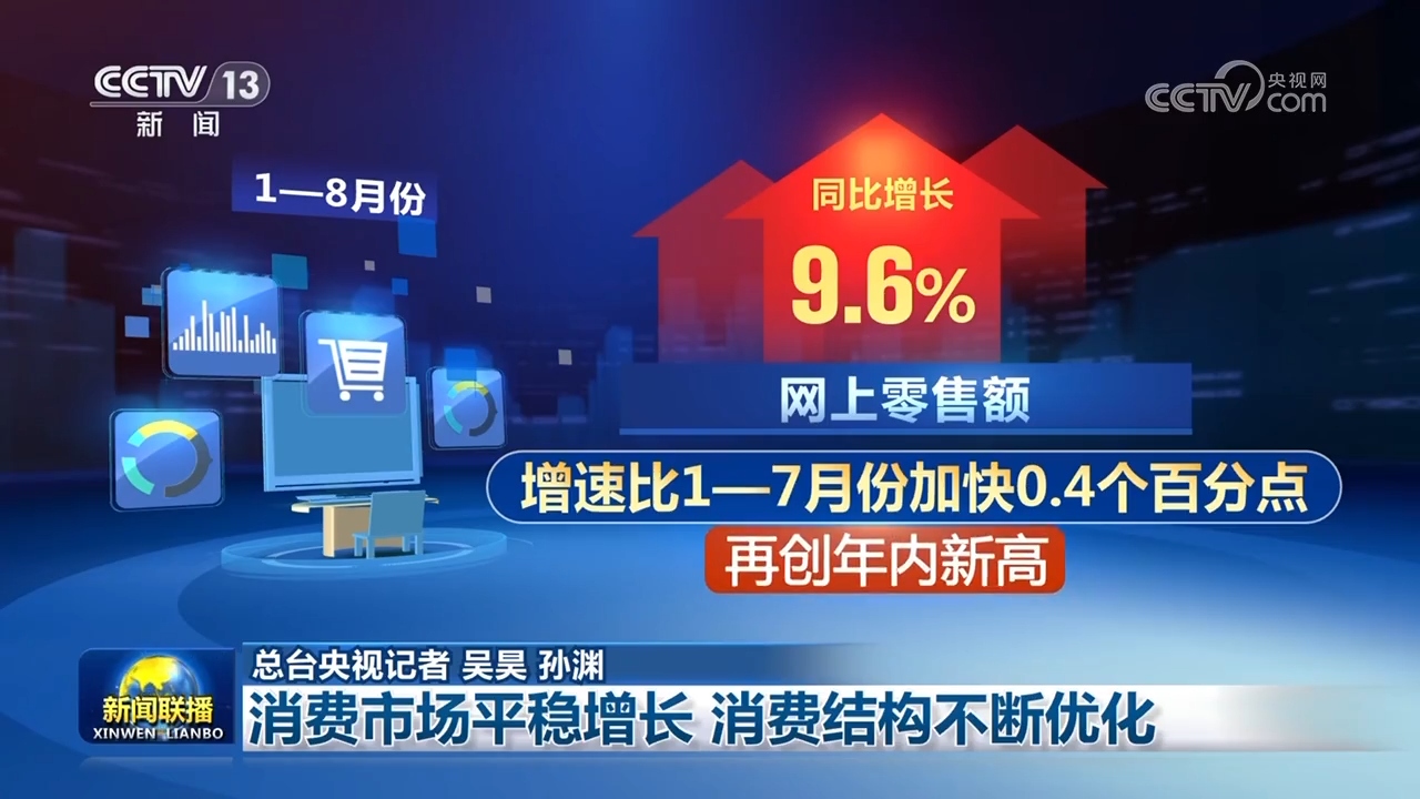 线上消费连续加快。1—8月份,网上零售额同比增长9.6%,增速比1—7月份加快0.4个百分点,再创年内新高。即时零售交易额和直播电商交易额均保持两位数增长态势,数字消费、绿色消费等新兴领域日益成熟,不断成为新的消费增长极。