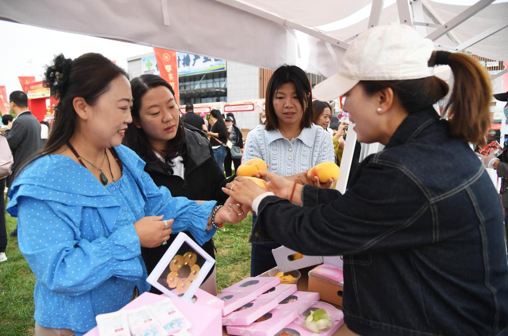 9月19日,北京市平谷区举办2025年中国农民丰收节暨第36届北京农民艺术节“乡村大舞台”平谷区专场展演。工作人员(右一)在活动现场向市民介绍农产品。新华社记者 任超 摄