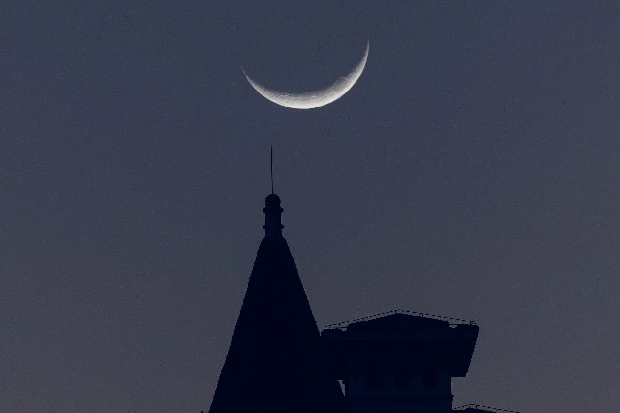 △2025年4月1日,安徽省淮北市,夜空中的超大蛾眉月。