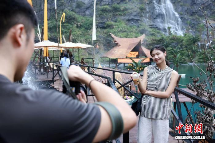 近日,浙江安吉余村,游客手持咖啡在瀑布前拍照。孙杨洋 摄