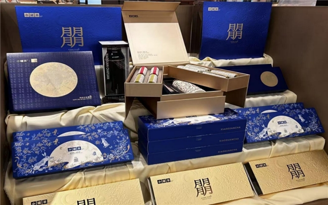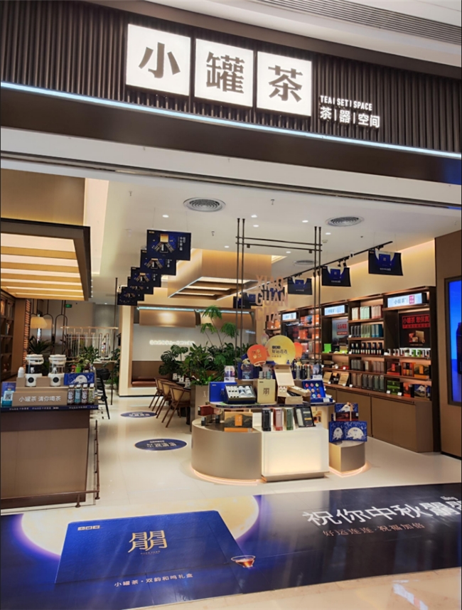 小罐茶连续数年以“朤”字作为中秋系列的核心视觉标识,逐步建立起较强的品牌识别度与产品延续性。在线下终端,小罐茶通过主题化陈列、统一色调与宣传物料,强化“朤”符号与中秋礼赠场景的关联,形成“未见其茶,先识其意”的视觉传达效果。
