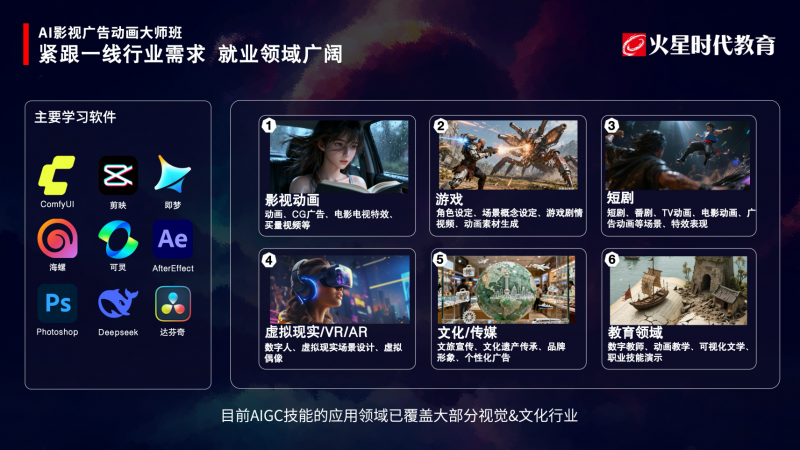 据介绍,火星时代教育AI影视广告动画大师班,总计8周全日制课程,区别于市面部分仅教授软件操作的培训,该课程依据火星时代“行业导向”职业课程体系进行研发,从AI视频创作的行业需求调研,到“项目实战”为核心的教学模块设计,再到“实用工具-商业思维-工业流程”的教学实施,均聚焦AI视频岗位需求出发。课程以前瞻性视角,把“创意思维+AI工具+传统工具”三位合一,特别涵盖视听语言,剪辑思维,运动规律,色彩理论,构图技巧,摄影技巧,镜头调度,叙事结构设计和广告创意理论的内容,提升学习者视频创作的底层能力;同时包含ComfyUI结合动画大模型、即梦、海螺、可灵、Veo、Runway等动画生成平台的应用以及大语言模型使用技巧等前沿AI工具,还包括AE,达芬奇等后期剪辑,合成,调色软件,进行音频处理、混音,掌握传统主流软件的AI插件和实用技术,带学员创作出引领新时代需求的AI商用视频。