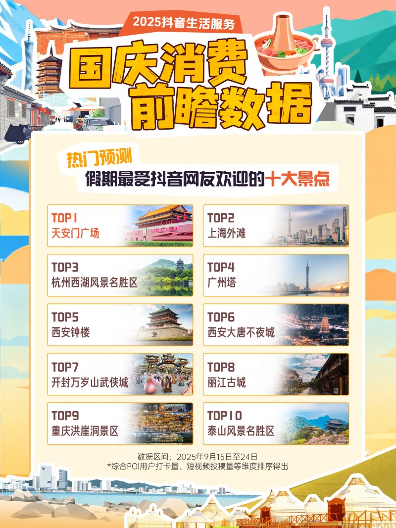 与此同时,经典旅游目的地依然魅力不减。抖音生活服务综合POI地理锚点打卡量和短视频投稿量等数据,预测了国庆期间最受网友欢迎的十大景点:天安门广场、上海外滩、杭州西湖风景名胜区、广州塔、西安钟楼、西安大唐不夜城、开封万岁山武侠城、丽江古城、重庆洪崖洞景区、泰山风景名胜区等颇受欢迎,成为假期人们追寻历史印记与自然人文体验的热门选择。
