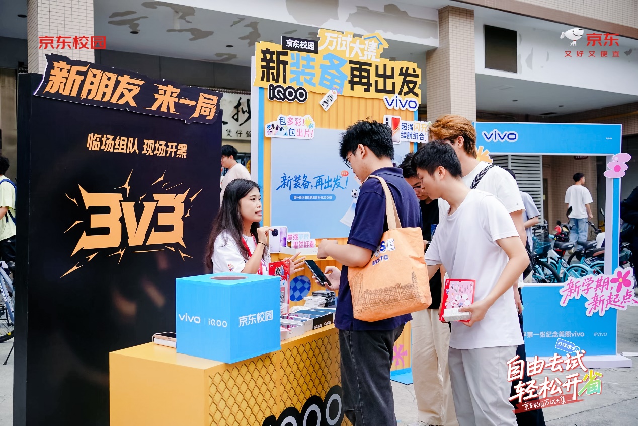 vivo&iQOO“新装备再出发”展区自发组织的3v3电竞赛引来阵阵喝彩,参赛者都能参与抽奖,教育优惠和24期免息政策吸引众多学生咨询。