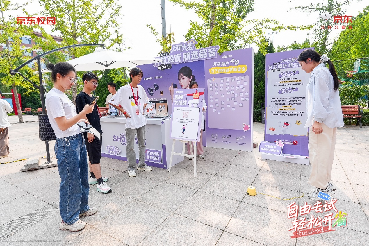 韶音“开放聆听就选韶音”展区创意十足,开放式耳机创新环绕耳夹设计带来全新聆听体验。学生们在宣言墙上写下新学期目标,佩戴试听后分享感受即可获得明星联名健身弹力带。学生优惠低至95折的优惠政策让许多学生现场下单。