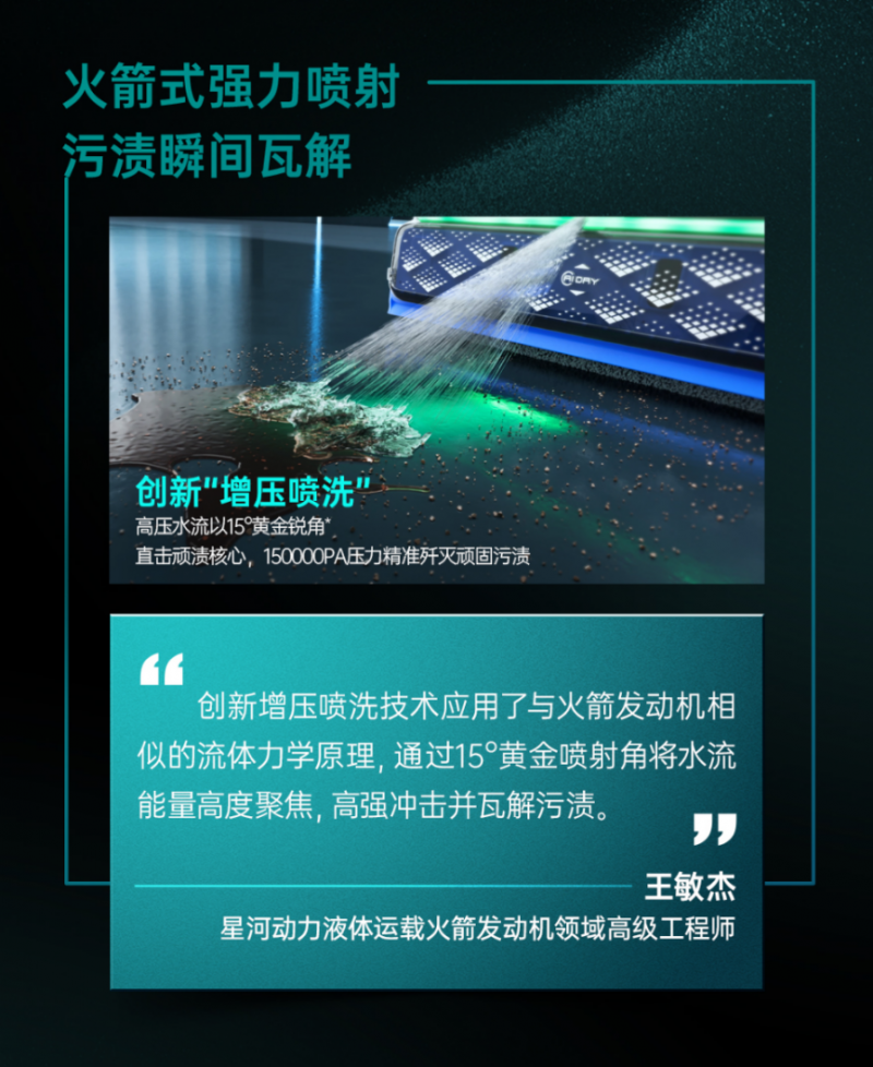 面对厨房地面风干的酱油渍、凝固的油污,芙万科学家系列搭载了一键增压爆喷科技。通过高压水流以15°的黄金锐角精准喷射,能在10秒内迅速瓦解顽固污渍。星河动力液体运载火箭发动机领域高级工程师王敏杰对此项技术展开解析:“创新增压喷洗技术应用了与火箭发动机相似的流体力学原理,通过15°黄金喷射角将水流能量高度聚焦,高强冲击并瓦解污渍。”