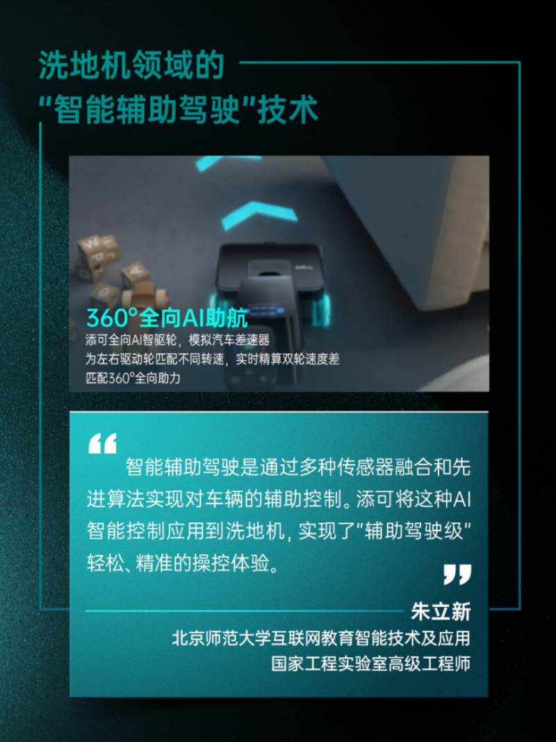 为了实现灵动自如的操控,添可芙万科学家系列还搭载了360°全向AI助航技术。其智驱轮模拟汽车差速器原理,可为左右轮匹配不同转速,无论是直线推拉还是小范围腾挪转向,都如臂使指,丝滑省力。这正是“智能辅助驾驶”技术在家用清洁设备上的创新应用。对此,北京师范大学互联网教育智能技术及应用国家工程实验室高级工程师朱立新分析道:“智能辅助驾驶是通过多种传感器融合和先进算法实现对车辆的辅助控制。添可将这种AI智能控制应用到洗地机,实现了‘辅助驾驶级’轻松、精准的操控体验。”