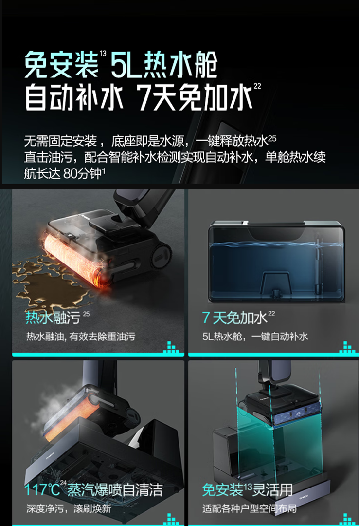在便捷性上,添可芙万科学家系列将“懒人福音”发挥到极致。5L热水舱不仅能自动为机器补水,且一次加满可满足7天使用,真正做到免安装、免频繁加水。其续航能力也堪称典范,2A超级快充技术让充电效率倍增,配合850mL清水箱与720mL污水箱,以及支持长达80分钟的超长续航,无论是日常维护还是大平层、别墅的深度清洁,都能一气呵成,告别续航与水电焦虑。更值得一提的是,其新一代智云电池拥有3倍循环寿命,并提供3年质保,让用户无后顾之忧。